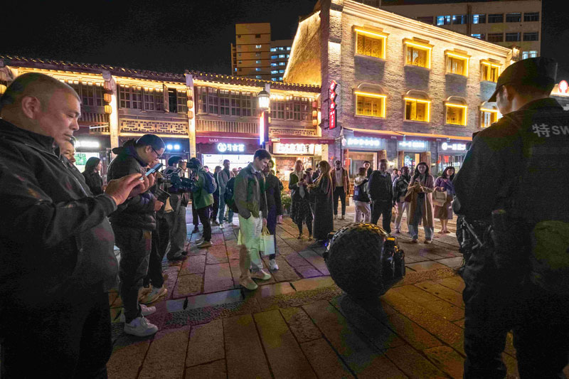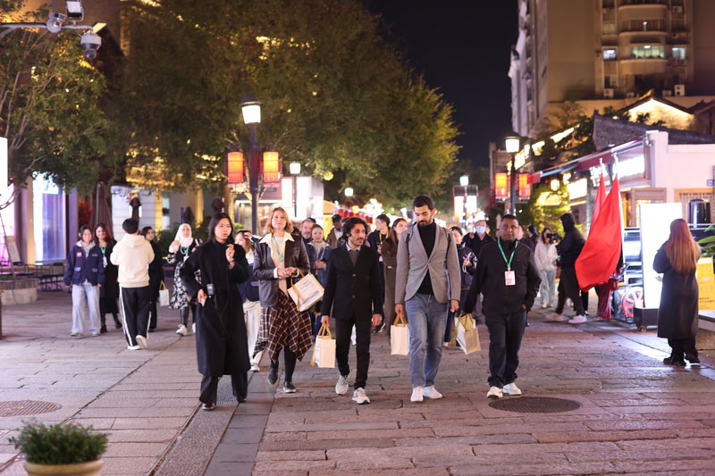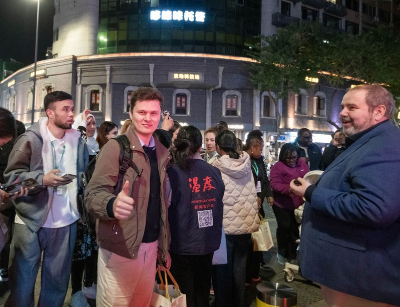 11月18日,2025海上丝绸之路城市合作发展大会暨国际旅行商大会在温启幕。当晚,海丝之路沿线部分城市市长、“洋网红”等,来到温州五马历史文化街区参观考察和谐共存的中西建筑、跨文化的时尚设计,连连点赞温州具有开放包容、融合创新、引领时尚的海丝文化。俄罗斯籍美女主播兰娜说:“我真的爱上这个地方!”