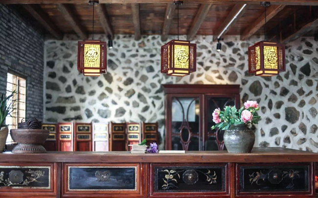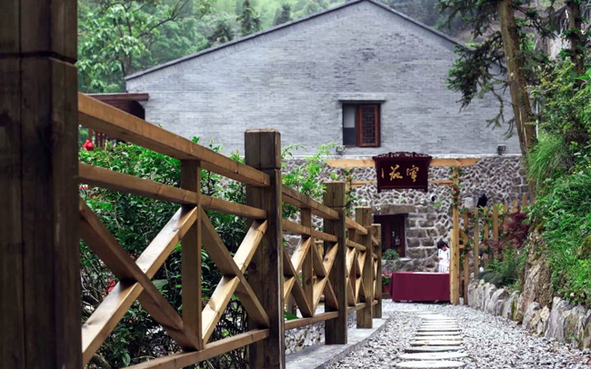 沿着古时驿道拾级而上,一个古朴的院落映入眼帘。与周遭绿意青葱不同的是,屋子周围花团锦簇,朱红的木质栏杆透出一种喜庆的感觉。前院里有石桌木椅和秋千,可聊天喝茶,可荡秋千,是朋友小聚的好场所。推门而入,眼前的中国风会有一种让你误以为闯入古装拍片现场的错觉,千百年前的大红花轿、青砖红椅、老地板的斑驳以及随处可见的精美雕刻。