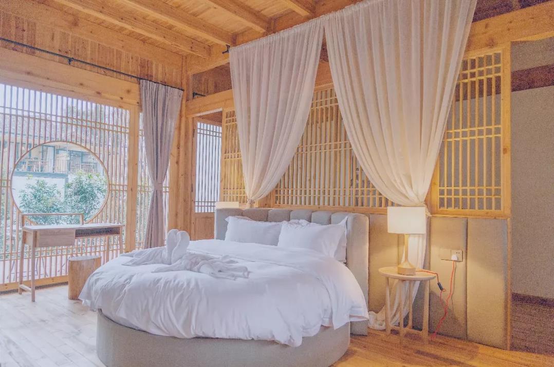 整个民宿保留了老建筑的滋味,又融入了当代时尚的元素,虽不奢华,却很讲究,有一种复古又略带俏皮感的畲乡风情。使用纯木搭建的建筑,与四周群山融为一体,天然而自然,一切都更贴近生命的本源。一脚踏入月蓝舍便有一种眼前一亮的感觉,初入庭院,只见院内有潺潺的小溪、高高的香樟树 、沙滩、躺椅,仿佛从山林跨越到了东南亚热带雨林。