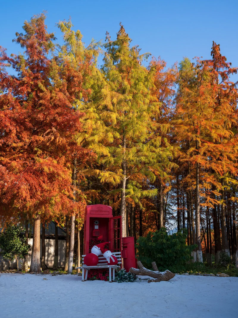 风拂过,林间沙沙作响,深浅的红色滤去了冬的萧瑟。阳光从叶隙洒落斑驳光影,漫步其下,如同坠入一场被自然精心调色的、铺天盖地的浪漫。限定色「#杉林红」已上新,收藏这份地图,去签收你的冬日浪漫~