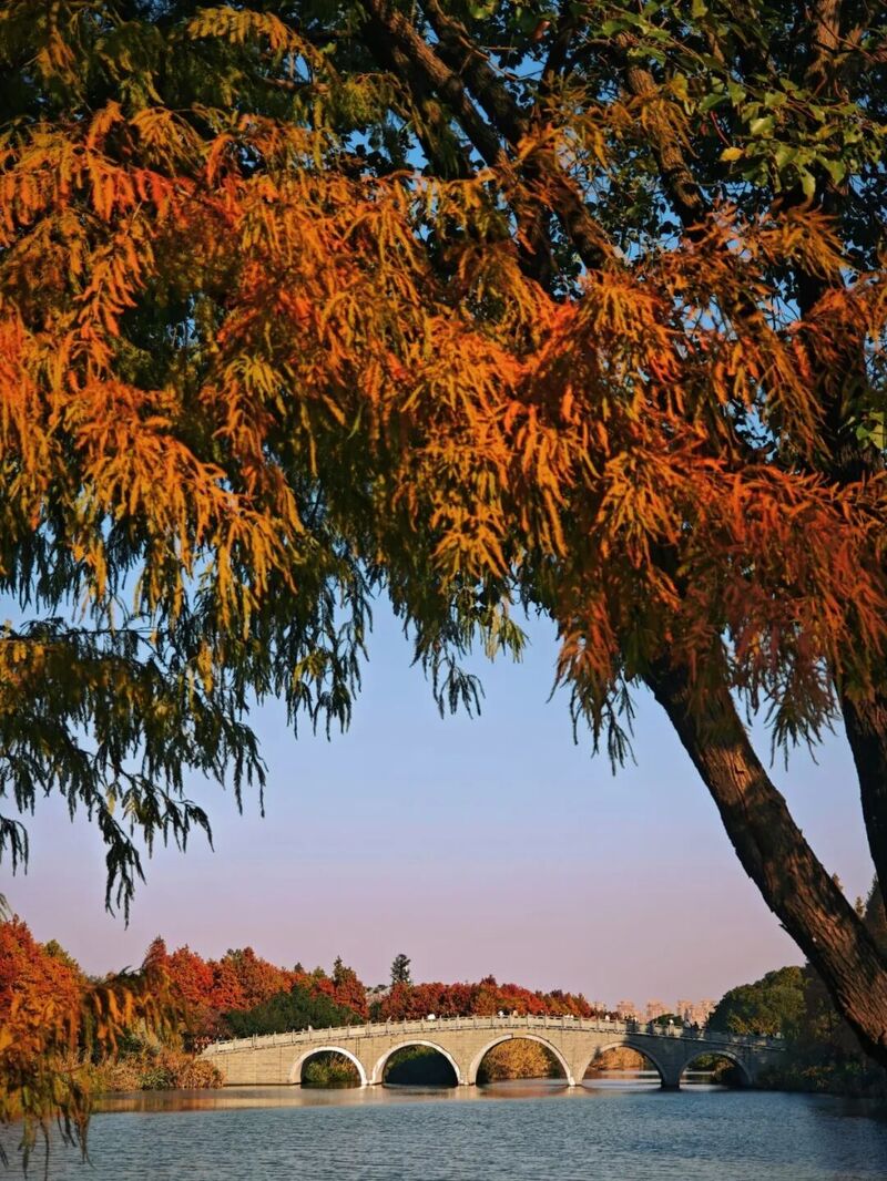 笔直的树干与暖红的叶,连同清晰的倒影,在江面轻轻框出一幅对称而安宁的暖色画。