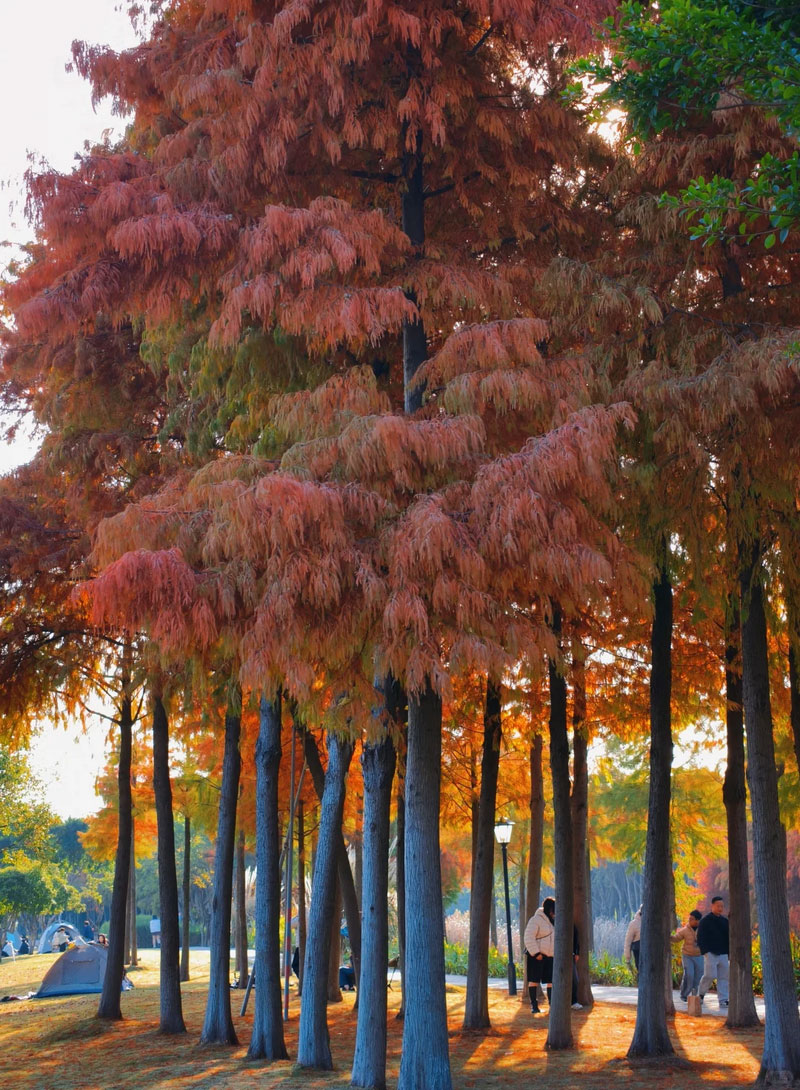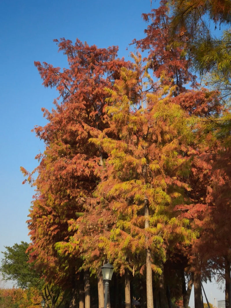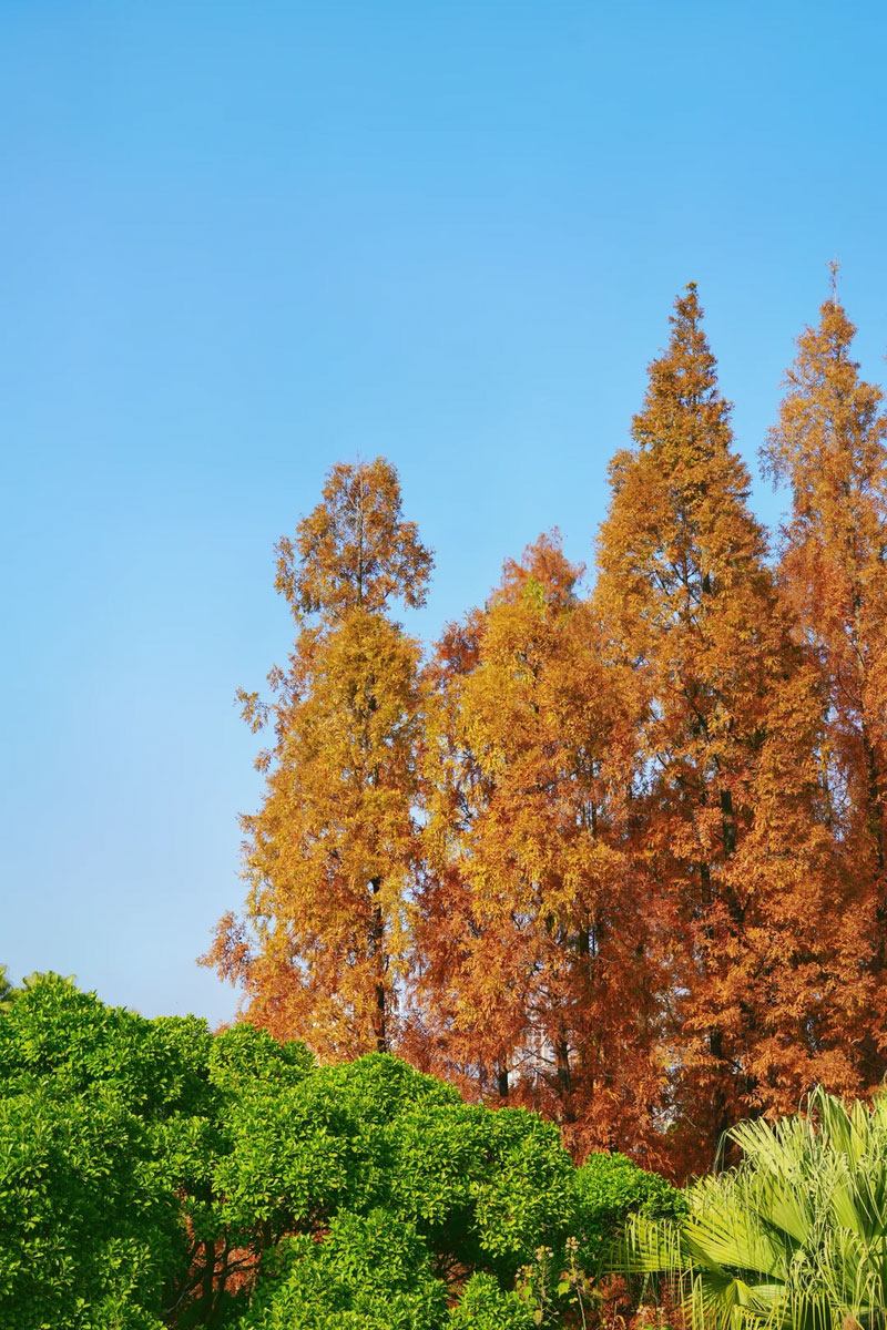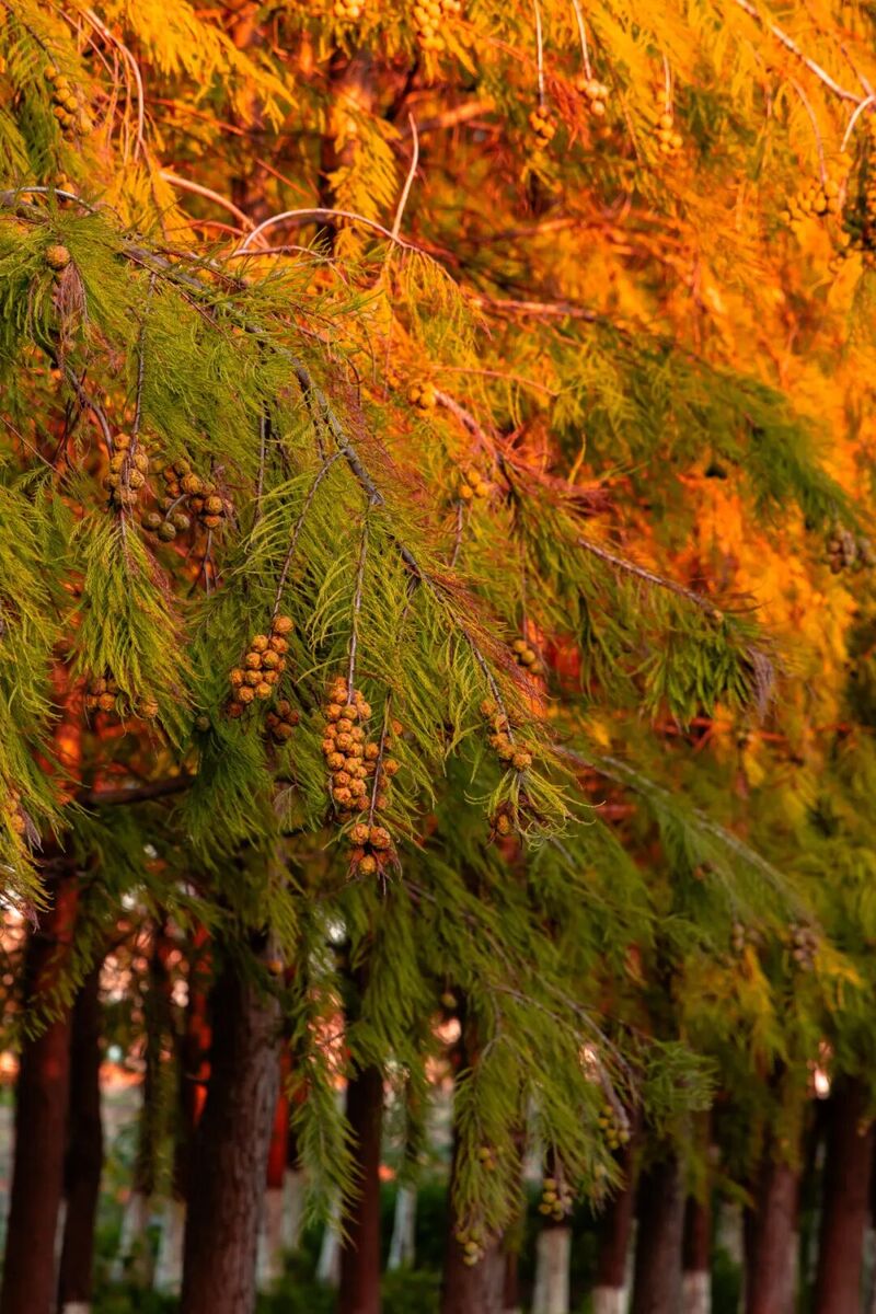 挺立的水杉完成了色彩的蜕变:从黄绿到红褐,在冬日晴空下熠熠生辉,宛如大地举起的一簇静燃的火焰。