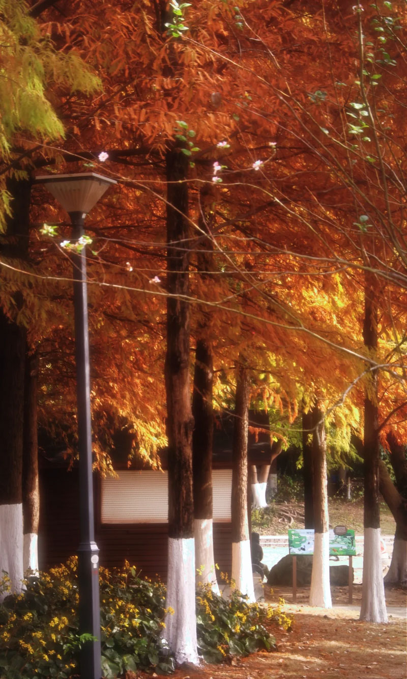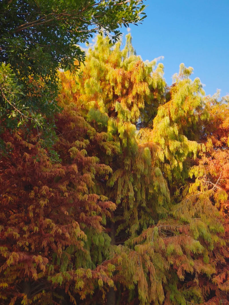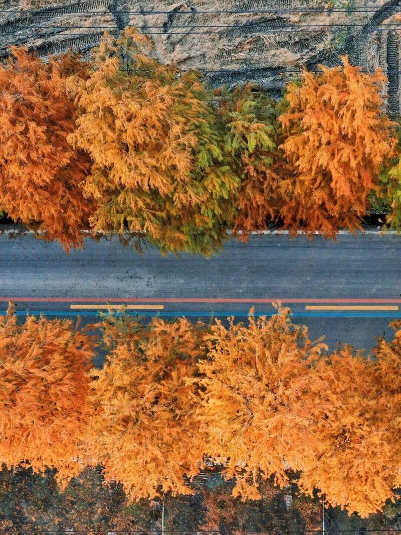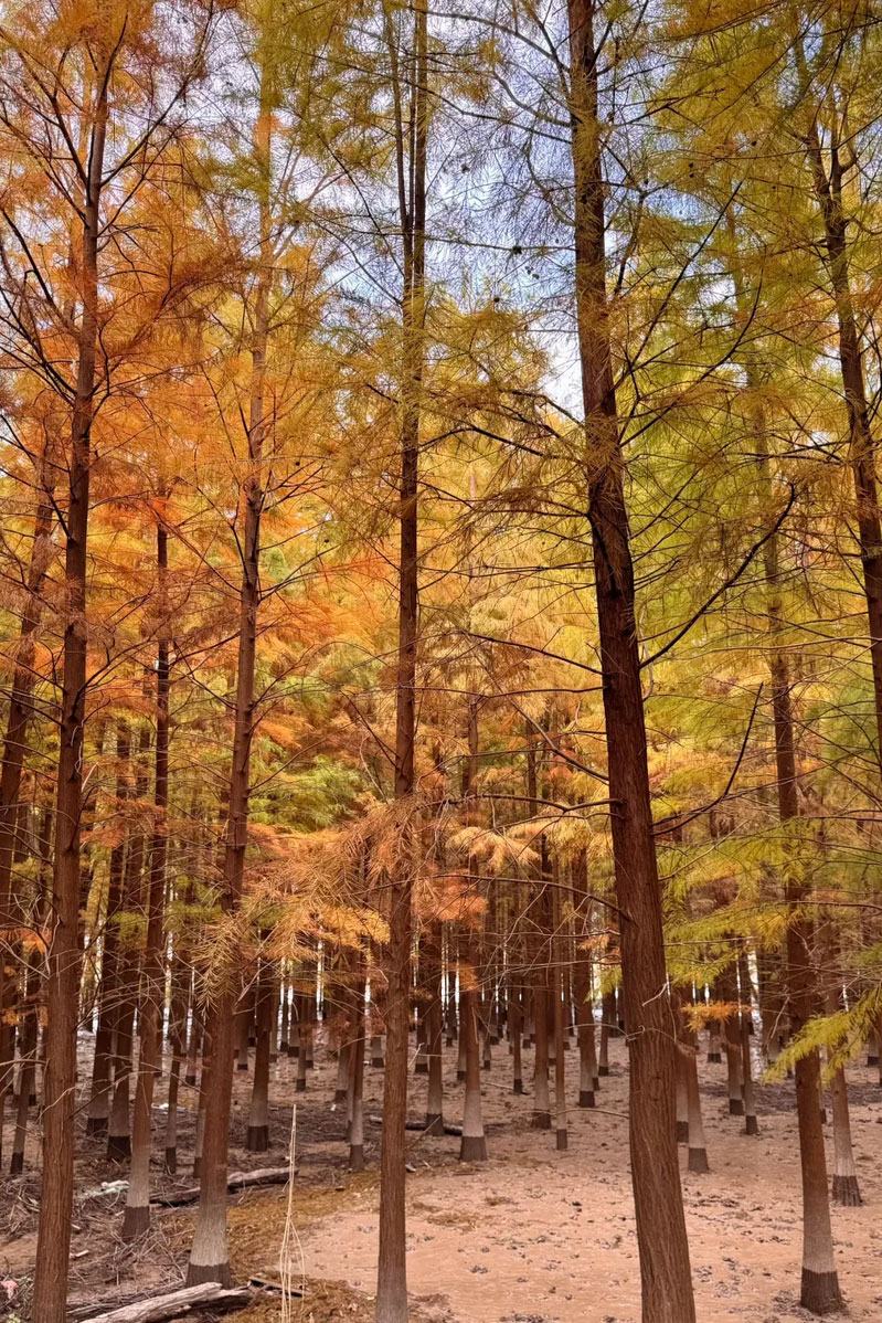 挺立的水杉完成了色彩的蜕变:从黄绿到红褐,在冬日晴空下熠熠生辉,宛如大地举起的一簇静燃的火焰。