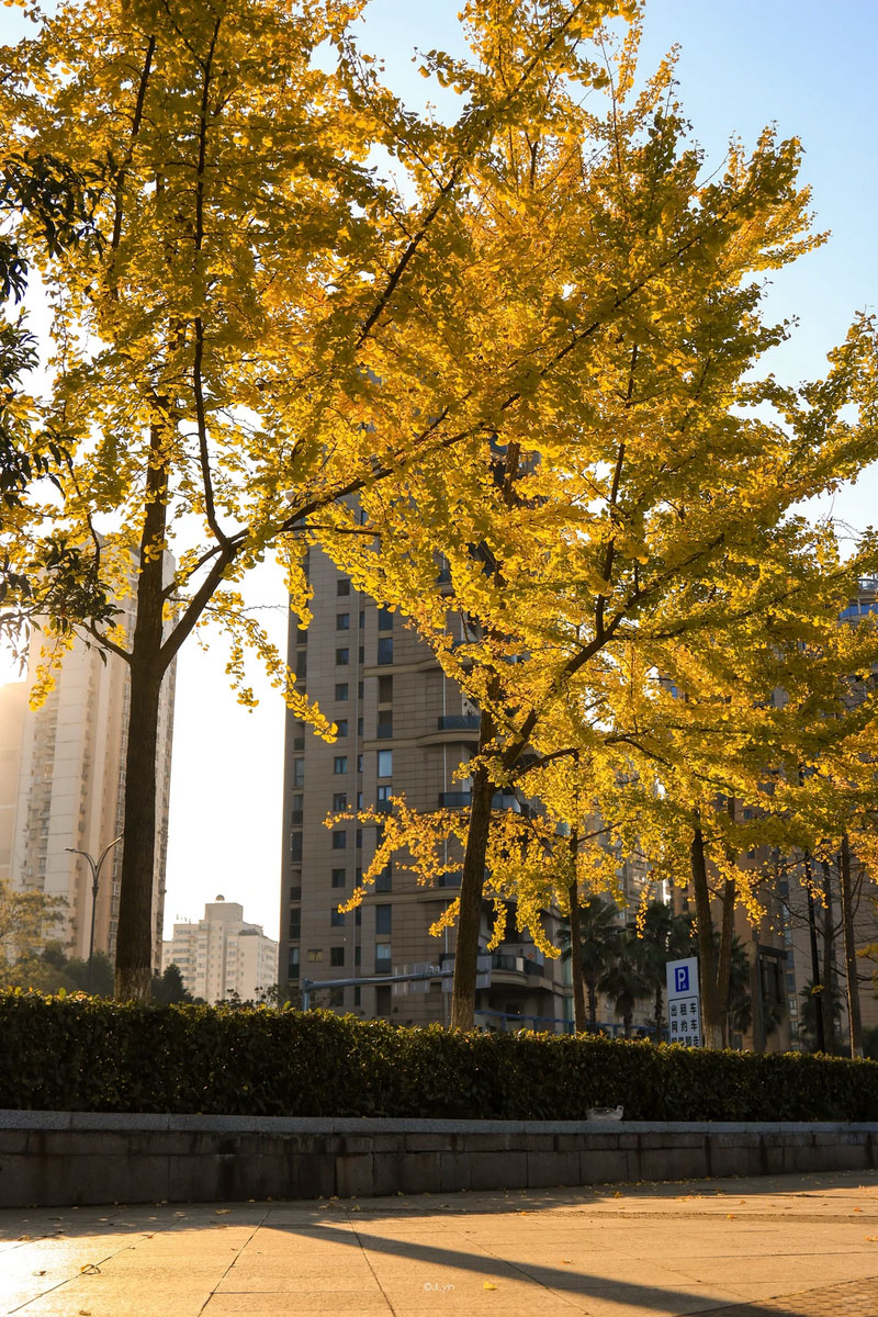 似是用油画棒描绘,这时节,温州大学城学子广场的银杏就已温柔得不像话。黄和绿是自然的渐变,还没黄全的银杏,似乎也别有风味。