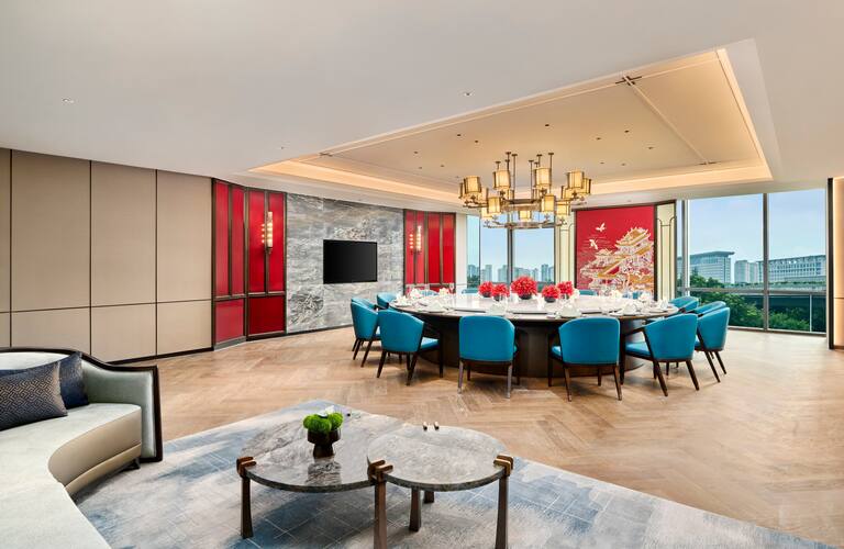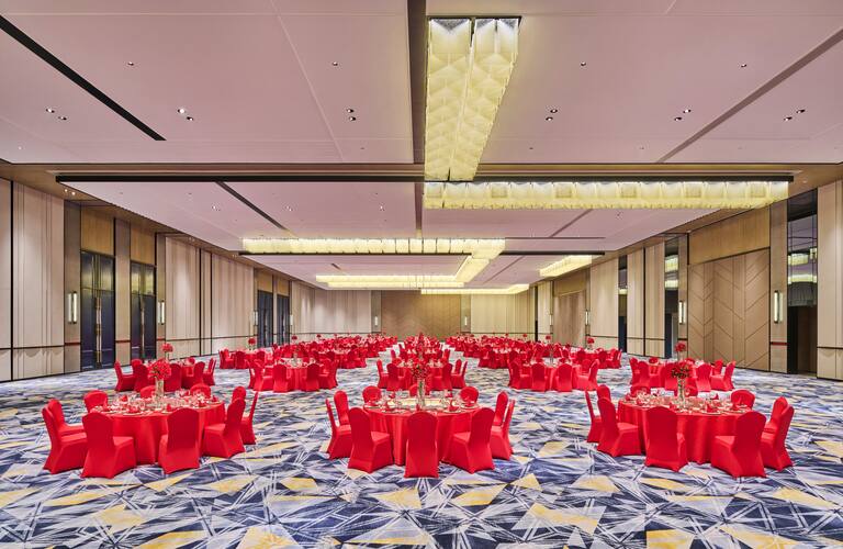 4.宴会会议:6000平方米无柱式宴会厅可分隔为三个独立空间,最大组合宴会面积达2400平方米,配有专业LED屏及灯光设备