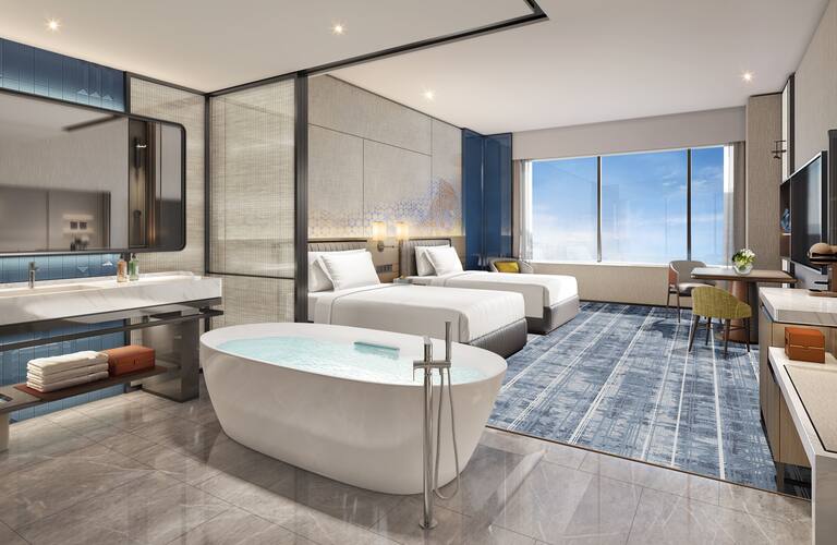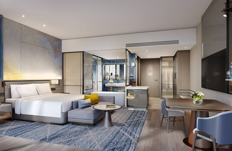 1.住宿区域:分布在建筑中高区,包含行政套房、豪华客房等房型,所有客房配备全景落地窗