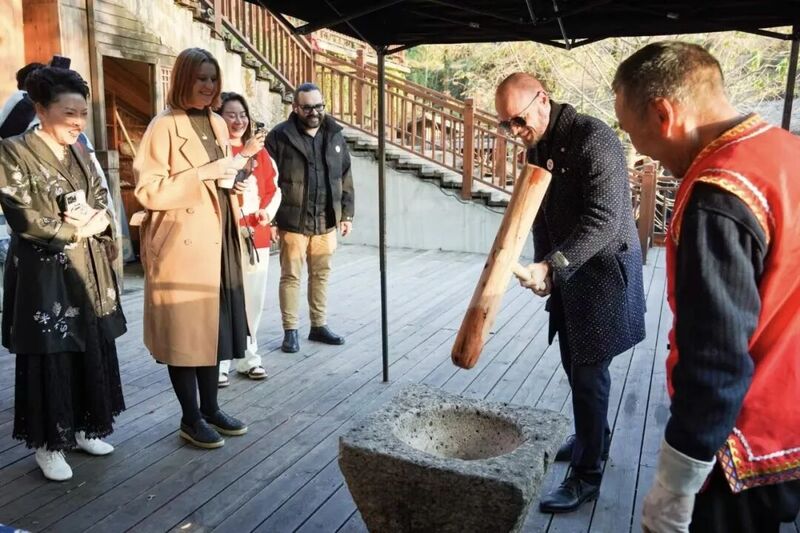 外籍友人首先来到具有浓郁畲族风情的西坑镇让川村,沉浸式体验拦路歌、竹竿舞、捣年糕、摇锅等畲族传统民俗活动,之后并参访百丈漈景区。多位外国友人举起手机,通过他们的个人社交平台,以“外眼”第一视角,向世界实时分享古老的村落、独特的习俗与壮丽的山水,将文成的文旅资源以最直接、最生动的方式推向世界,实现了从“请进来”体验到“走出去”宣介的完美融合。