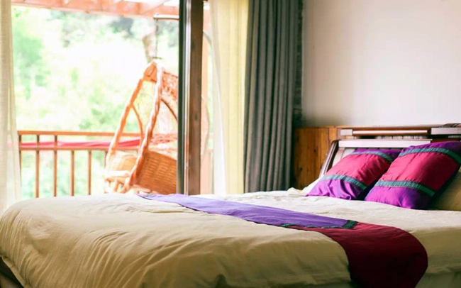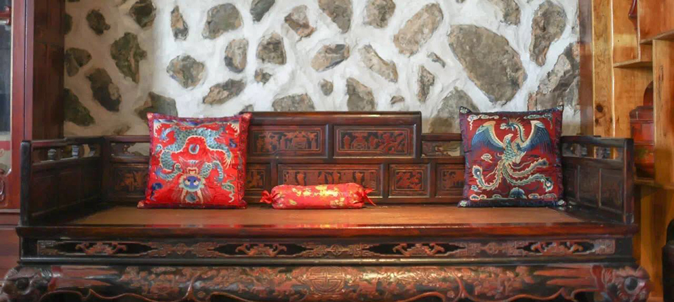 沿着古时驿道拾级而上,一个古朴的院落映入眼帘。与周遭绿意青葱不同的是,屋子周围花团锦簇,朱红的木质栏杆透出一种喜庆的感觉。前院里有石桌木椅和秋千,可聊天喝茶,可荡秋千,是朋友小聚的好场所。推门而入,眼前的中国风会有一种让你误以为闯入古装拍片现场的错觉,千百年前的大红花轿、青砖红椅、老地板的斑驳以及随处可见的精美雕刻。
