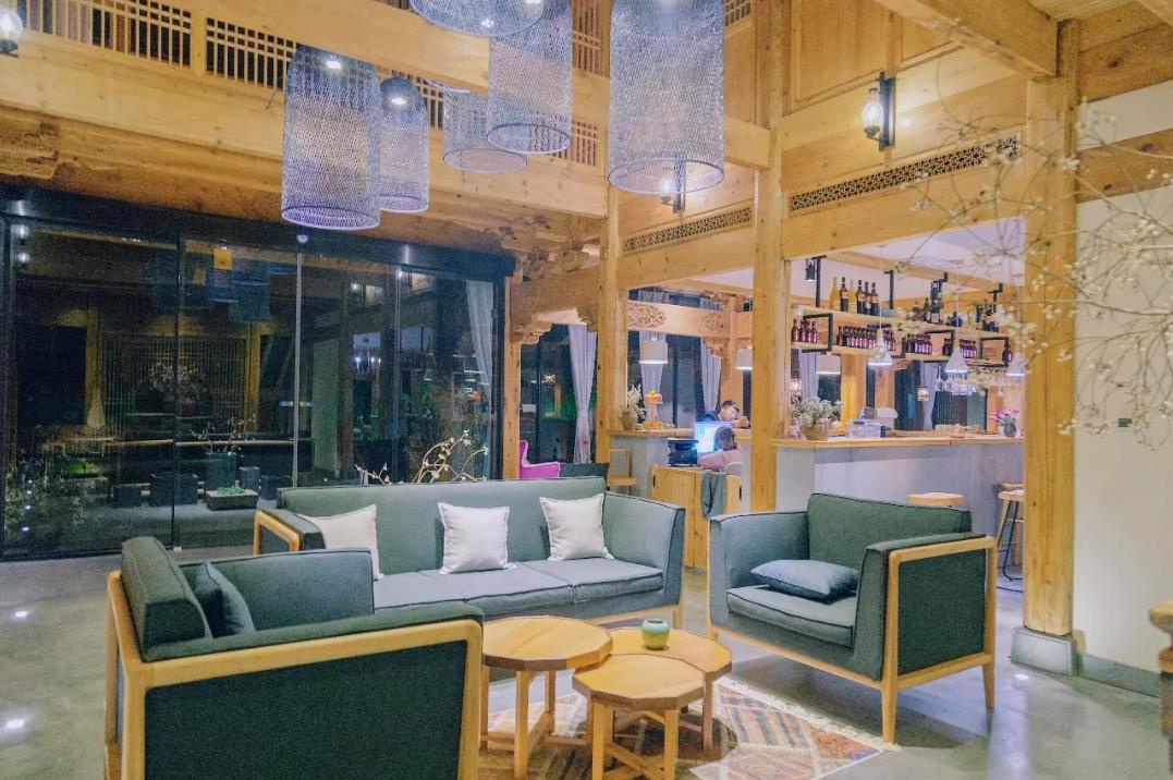 一楼地面采用水泥自流平水磨,大厅一周采用大面积的玻璃借景入室,再有彩色布艺沙发的点缀,用心打造了接待大堂、酒吧、咖啡馆于一体的多功能空间。整个大堂的公区不大却功能齐全,吧台、会谈区、壁炉区应有尽有。