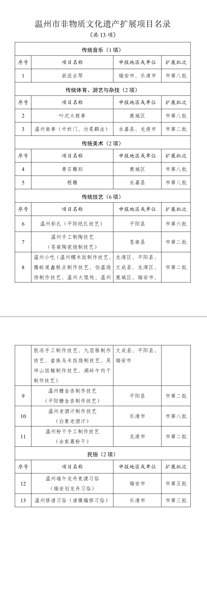 市政府批准市文化广电旅游局报送的第十二批温州市非物质文化遗产代表性项目名录(44项)和扩展项目名录(13项),现予以公布。各地和各单位要以习近平新时代中国特色社会主义思想为指导,按照《中华人民共和国非物质文化遗产法》《浙江省非物质文化遗产保护条例》等法律法规要求,认真落实《温州市非物质文化遗产管理办法》,坚持“保护为主、抢救第一、合理利用、传承发展”的工作方针,扎实做好非物质文化遗产的保护规划、安全管理、传承活化工作,切实提升非物质文化遗产系统性保护、管理、开发和利用水平,为繁荣发展瓯越文化、加快建设高水平文化强市作出新的更大贡献。