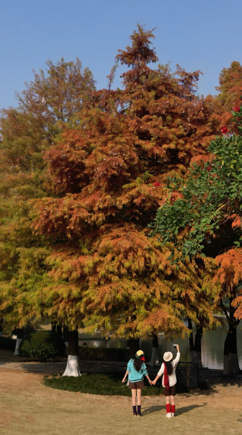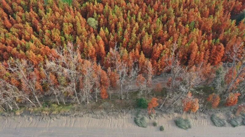 挺立的水杉完成了色彩的蜕变:从黄绿到红褐,在冬日晴空下熠熠生辉,宛如大地举起的一簇静燃的火焰。
