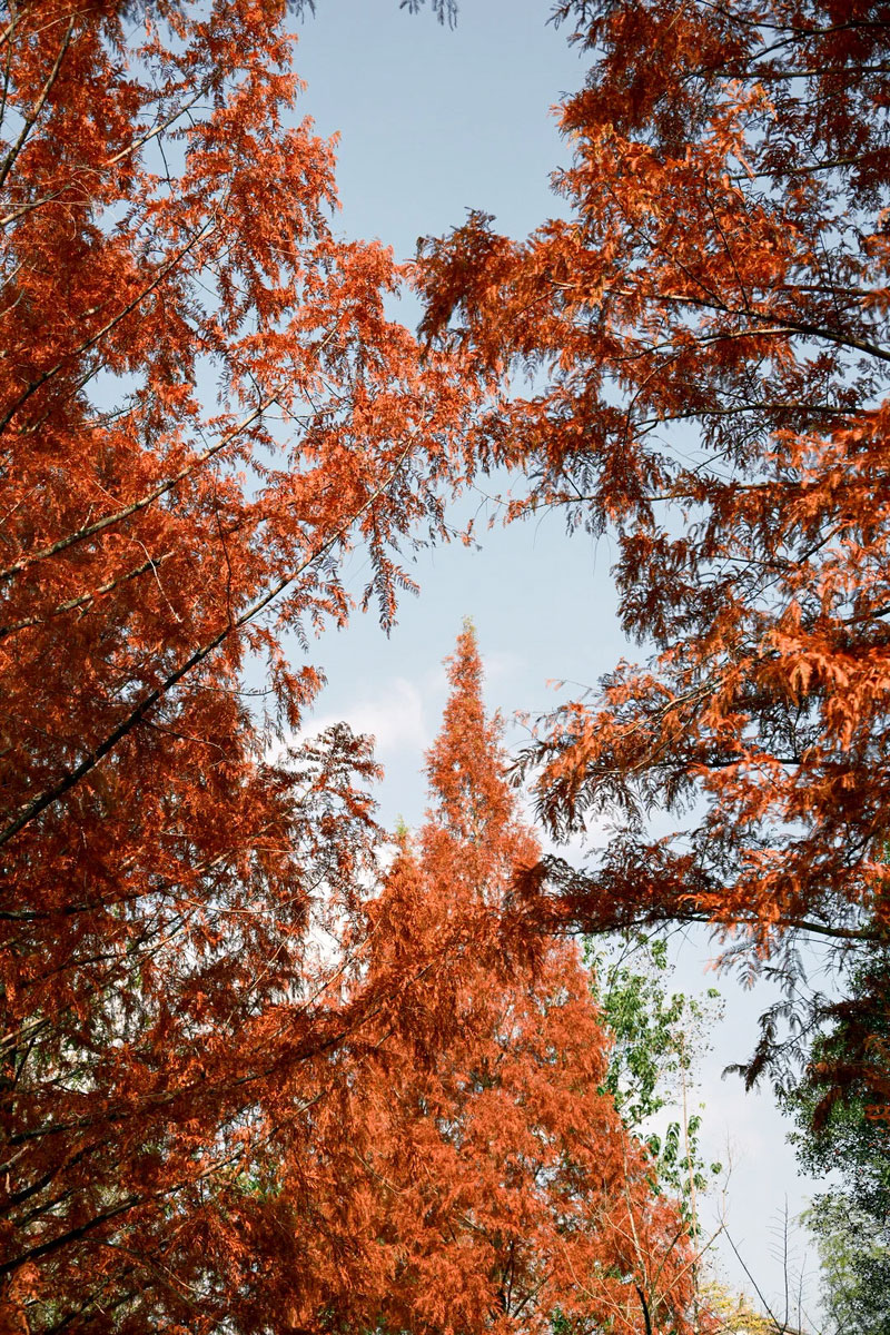 棕红的枝干笔直延伸,秋冬的深红枝叶在镜头中交织出一种温暖、柔和的氛围,仿佛自带静谧的胶片质感。