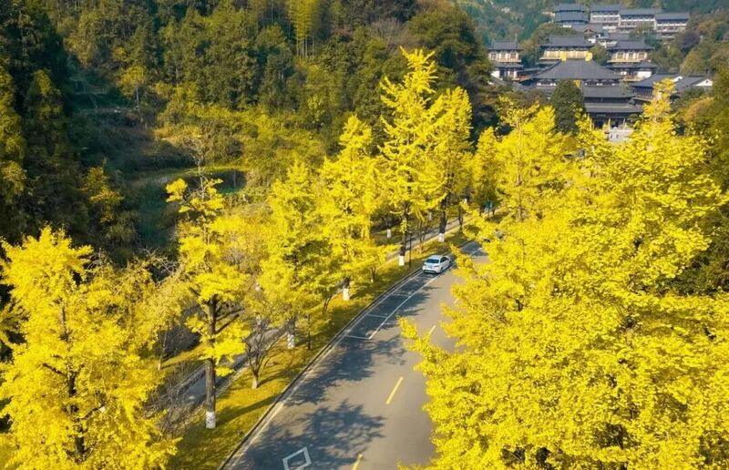 文成天圣山脚下、安福寺前的银杏大道,已流淌成一条百米的鎏金长廊。40余株古木挺拔入云,在初冬阳光下舒展着被时光淬炼出的璀璨。